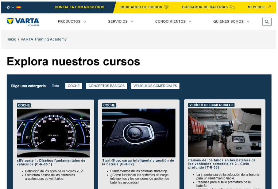 La plataforma de VARTA ofrece tres categorías de cursos de formación: Conceptos Básicos, Coche y Vehículos Comerciales.